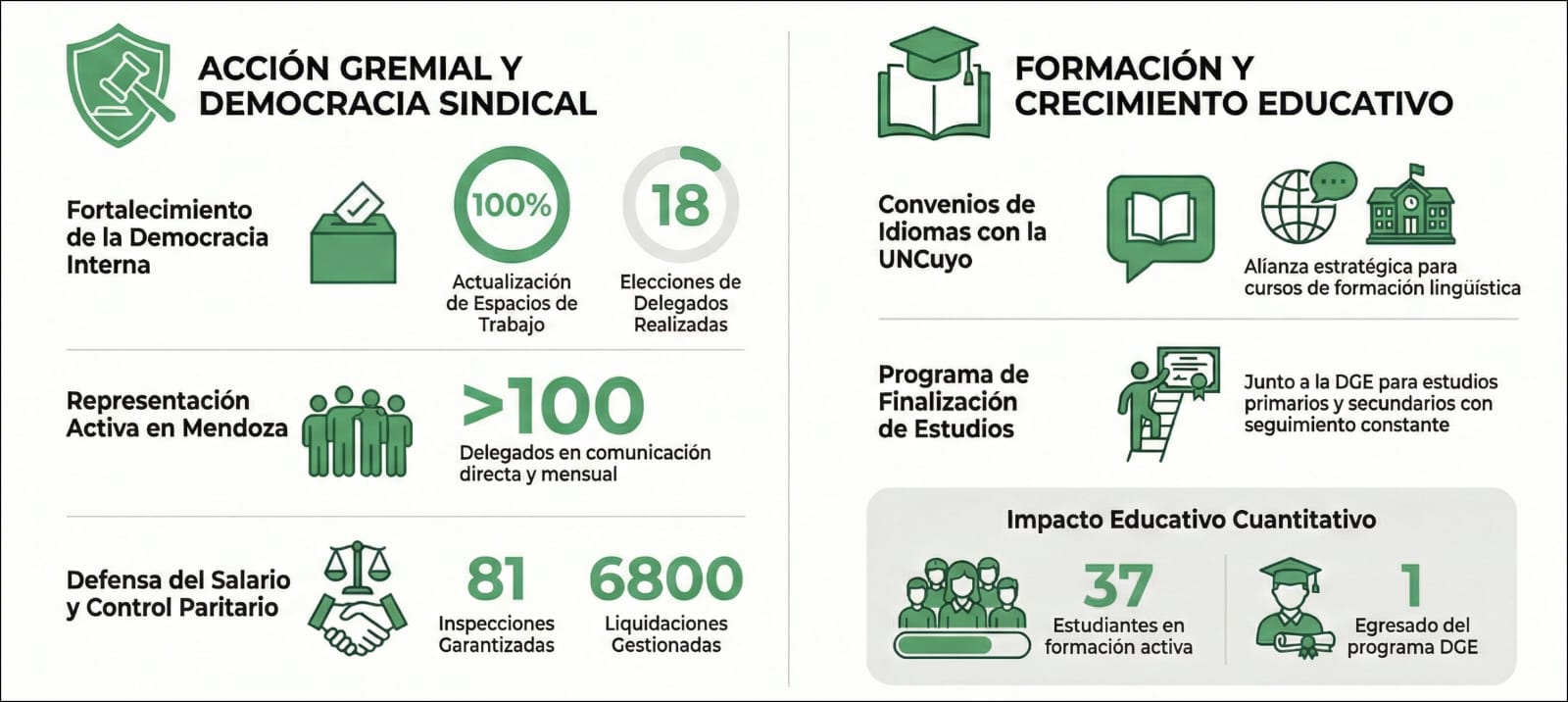 Entendemos que el crecimiento de nuestra familia es integral‭. ‬Por eso‭, ‬impulsamos convenios con la Universidad de Cuyo para cursos de idiomas y mantuvimos un programa sólido junto a la DGE para la finalización de estudios primarios y secundarios‭. ‬Este año‭ ‬celebramos con emoción al primer egresado bajo esta modalidad‭, ‬un símbolo del esfuerzo que acompañamos con seguimiento constante‭ ‬para los 37‭ ‬afiliados que hoy continúan su formación‭.‬